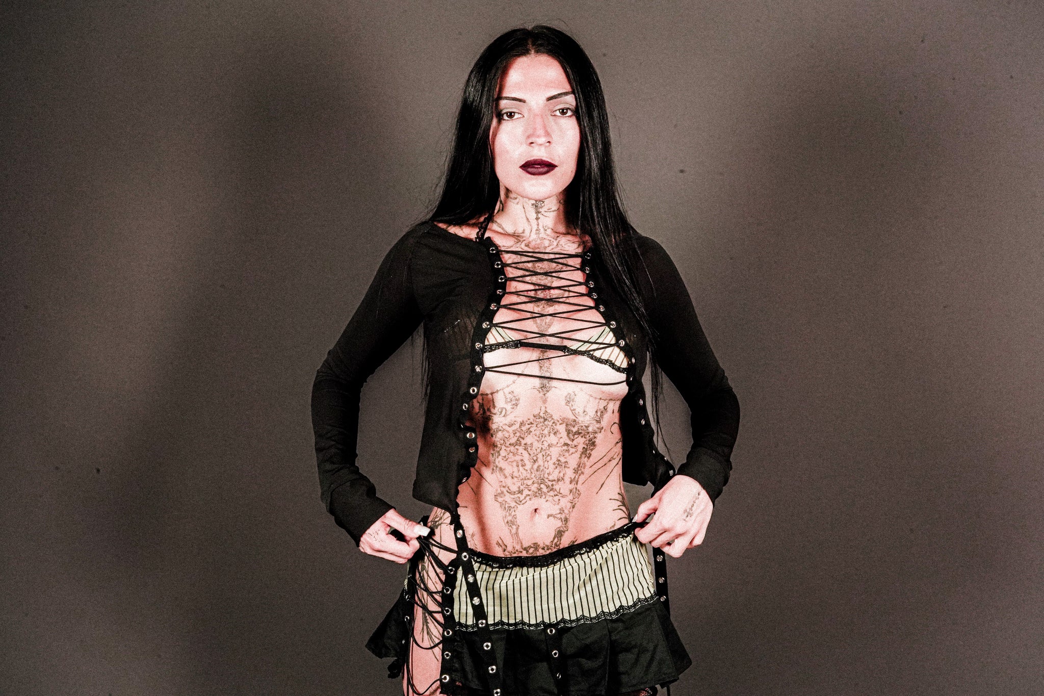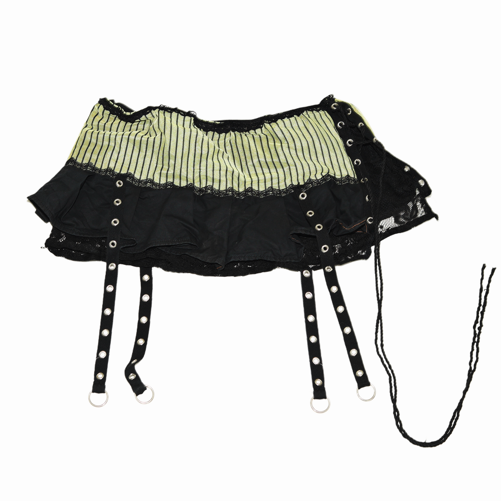 Pin stripe mesh skirt with silver details and lace string.