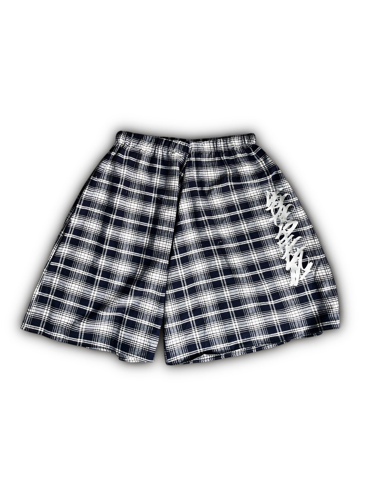 Tartan navy blue flanelette baggy shorts, embellished with large odd chaos chrome calligraphy logo down the side of the leg. UNISEX, COMFORTABLE, STEEZY.